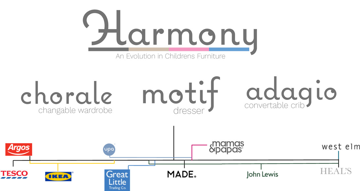To continue the product I would look into expanding the brand further, making a range of products that follow the same values and ideals of the Opus desk. The wider range would go under the name Harmony, relating to the fact the furniture is in perfect Harmony with the child as they grow. Below are some examples of other pieces that could be made in this range along with the market area the range would be targeted for.
